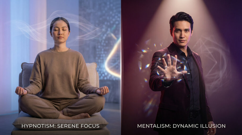 C’est souvent ici que le public perd le fil. L’hypnose de spectacle vise le divertissement pur, ce qui la rapproche inévitablement du mentalisme. Pourtant, la mécanique interne reste de l’hypnose : on utilise la suggestion directe pour modifier temporairement la réalité du volontaire. 🎭